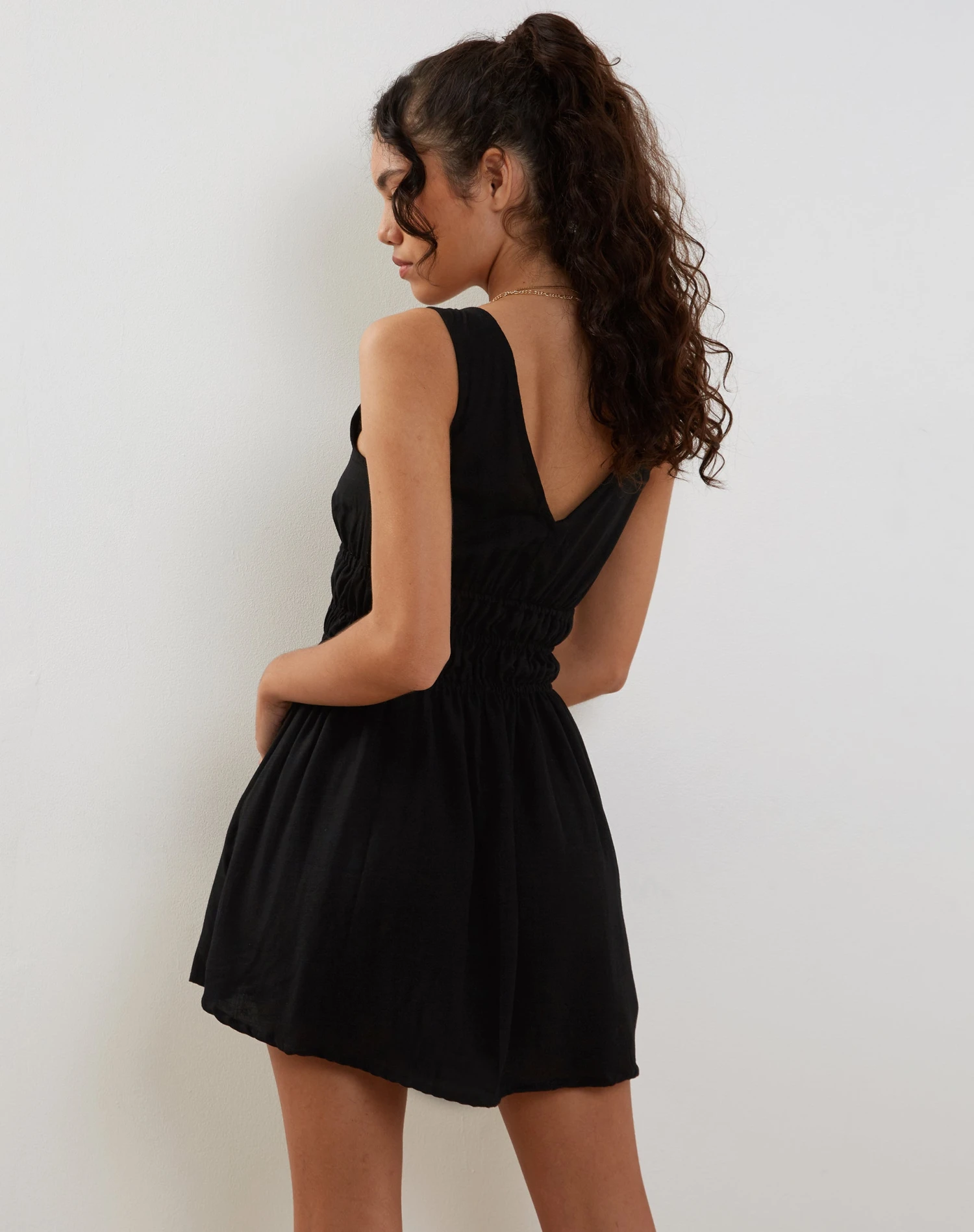 The Valhala Mini Dress in black features a plunge neckline, an open tie front, with a flowy hem.