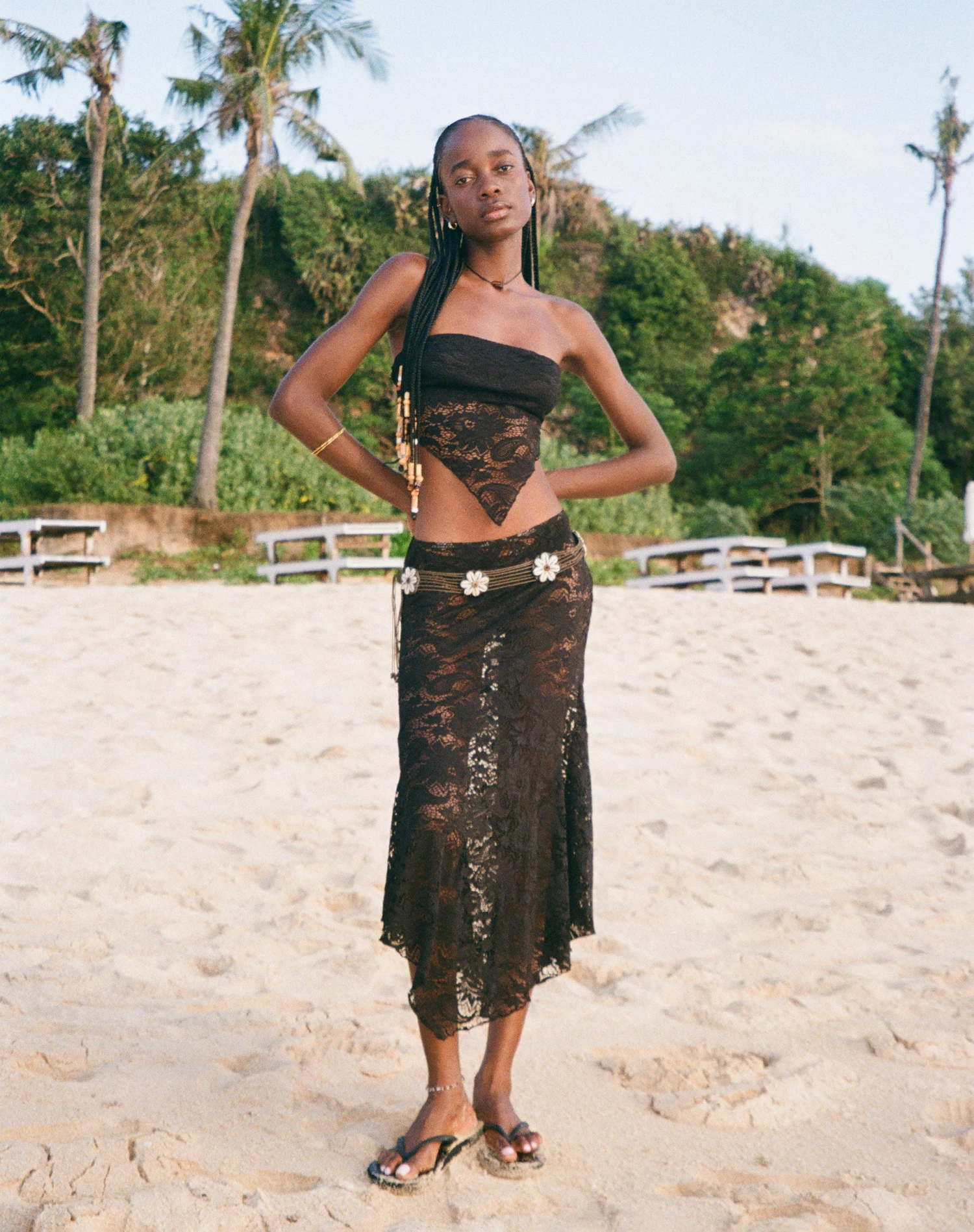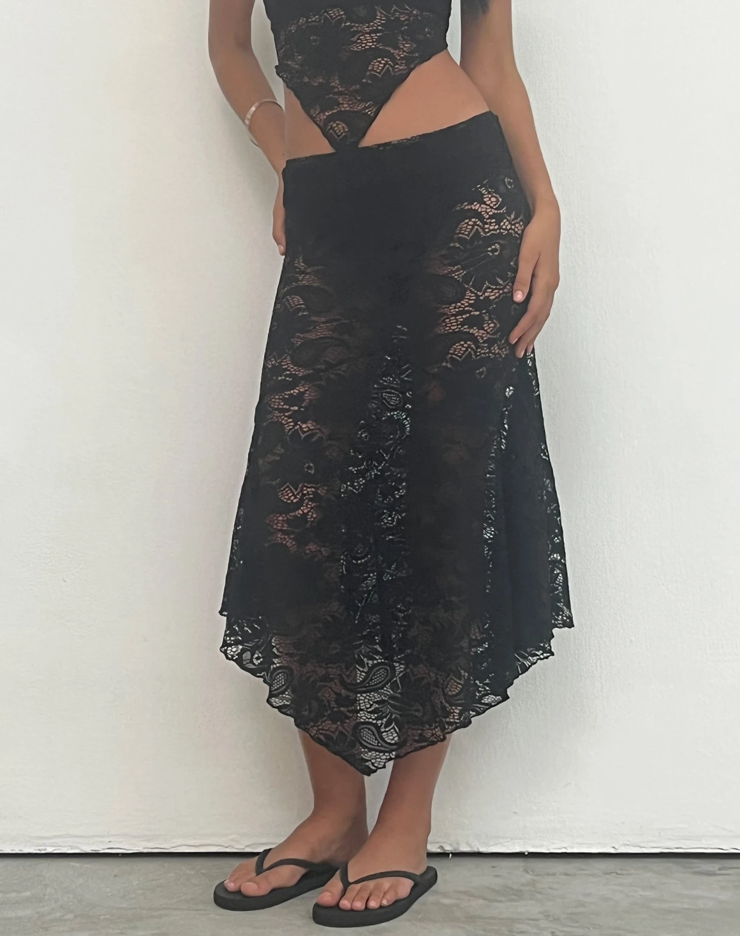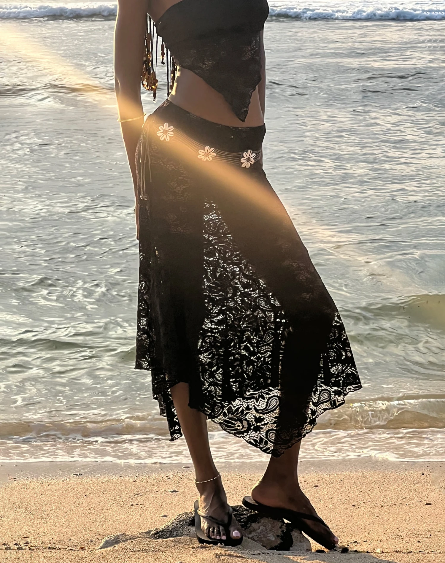 Not your moms midi…In an all over jet black lace with a waterfall hemline, Vana is the perfect skirt for festi’ season. Match it up with our Nirva bandana top.