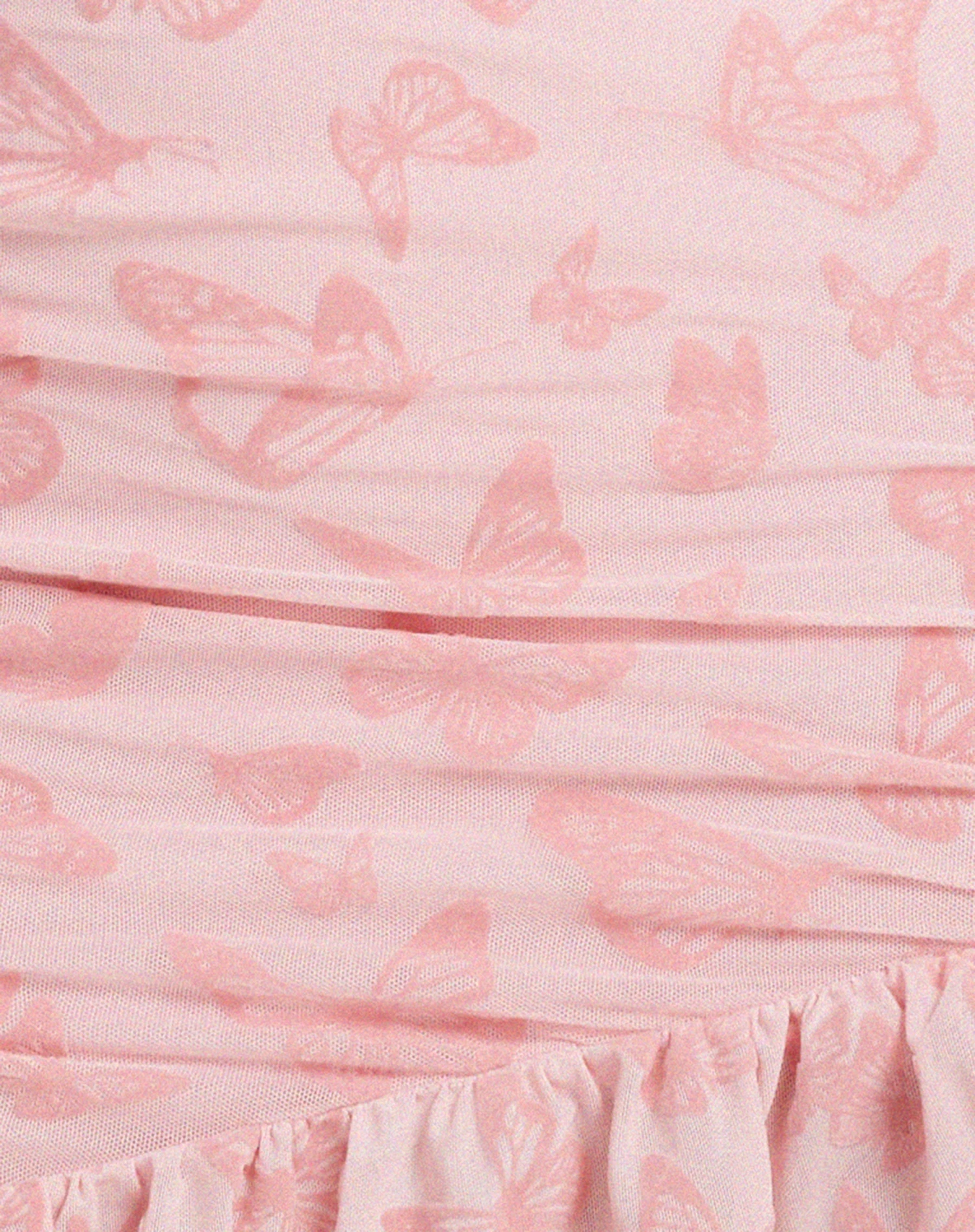 Add some prints to your summer style with the Vania dress. Featuring a mini fit with thin straps and frilled hem in a pink butterfly print. Simply style with white boots to complete your look.