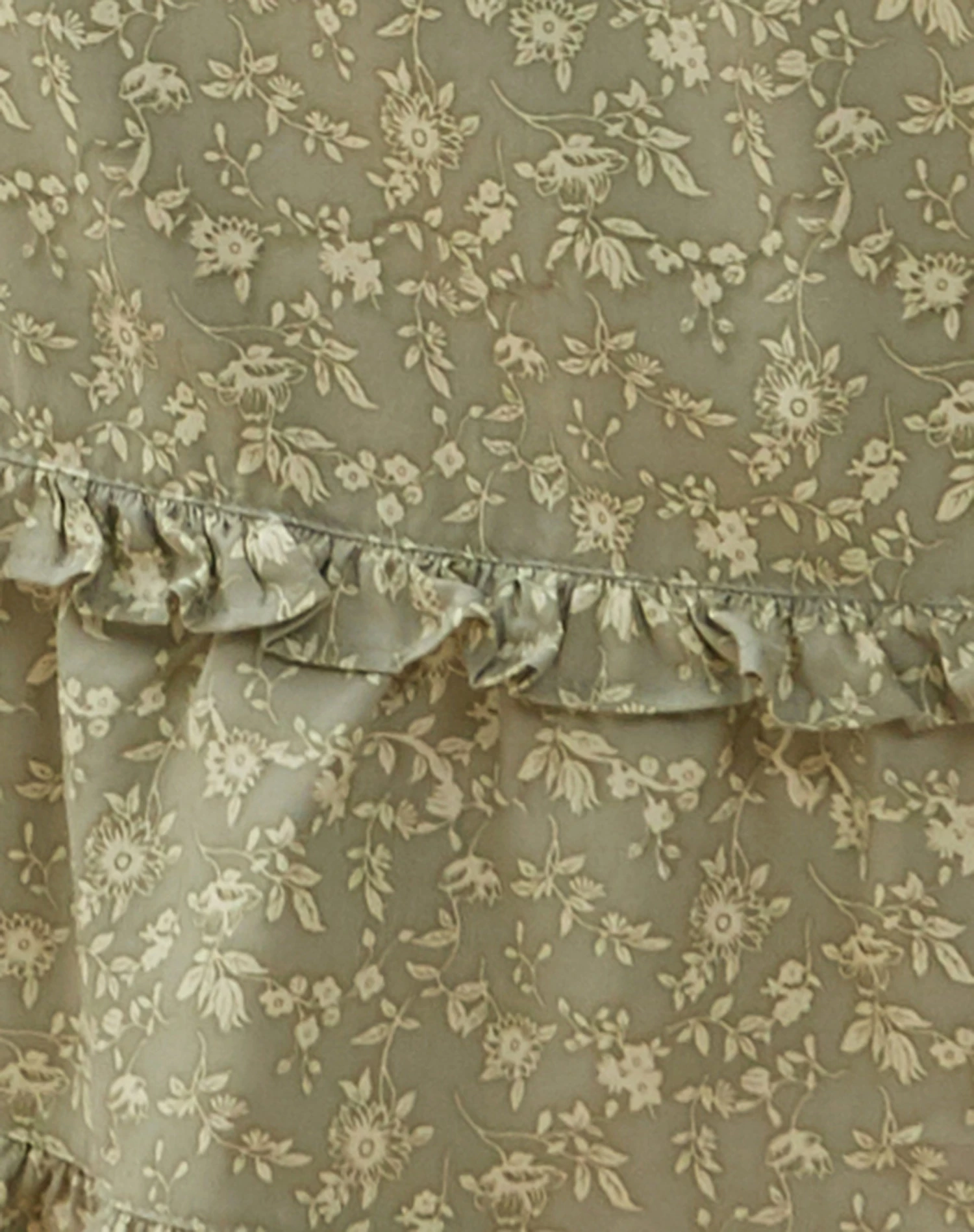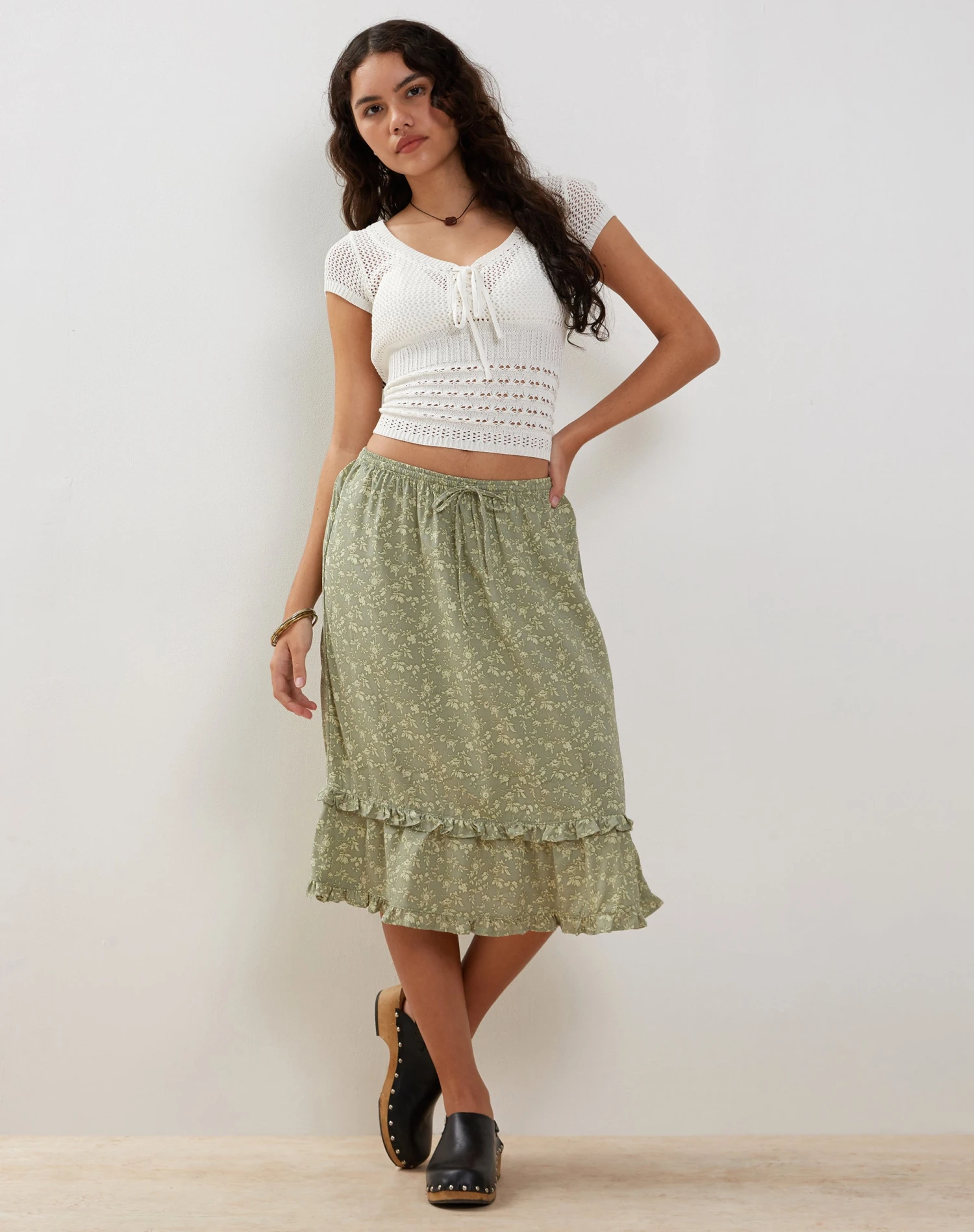 The Wala skirt comes in a midi length, featuring a ruffle hem and a floral green print.