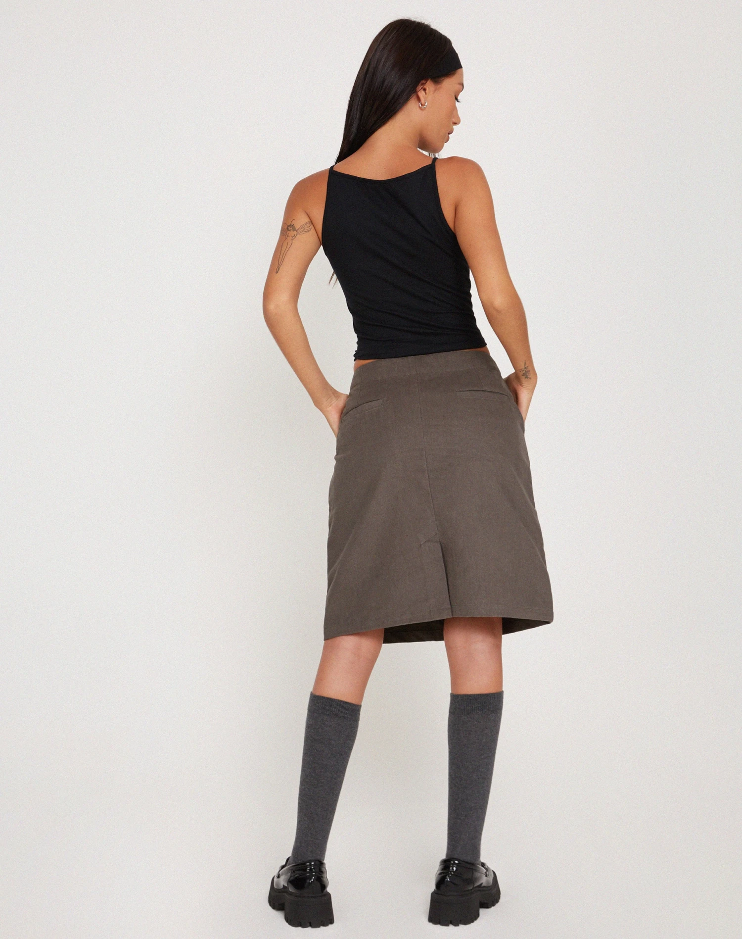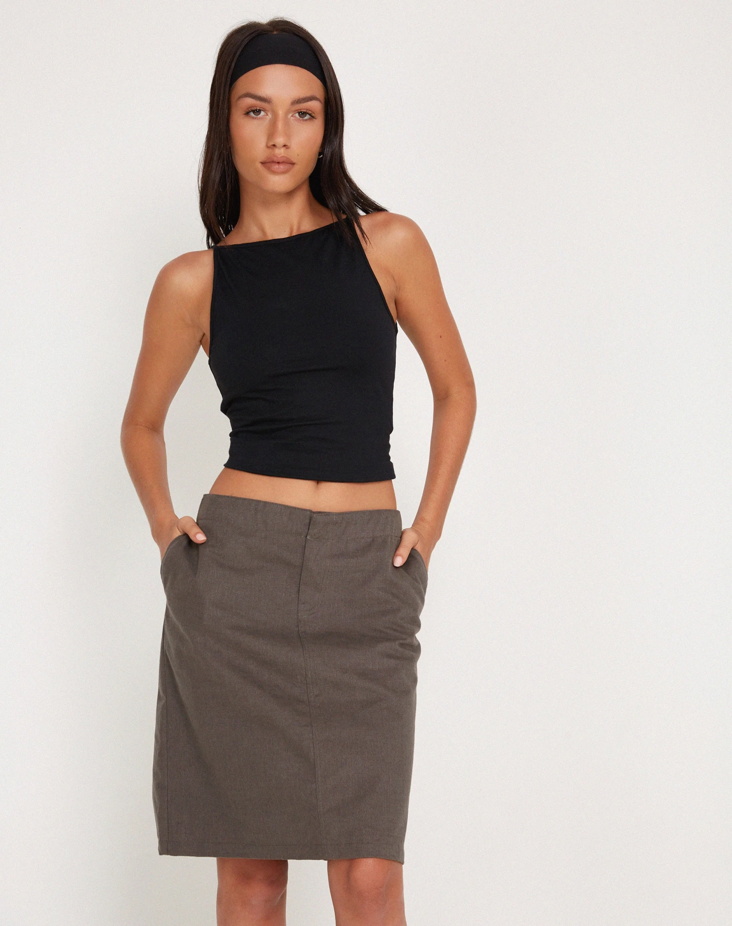 Introducing the Yahya Midi Skirt, featuring a low rise waistline in a chic dark grey colour, perfect for day or night! Complete the look with our Phindi top and Tumbas jacket.